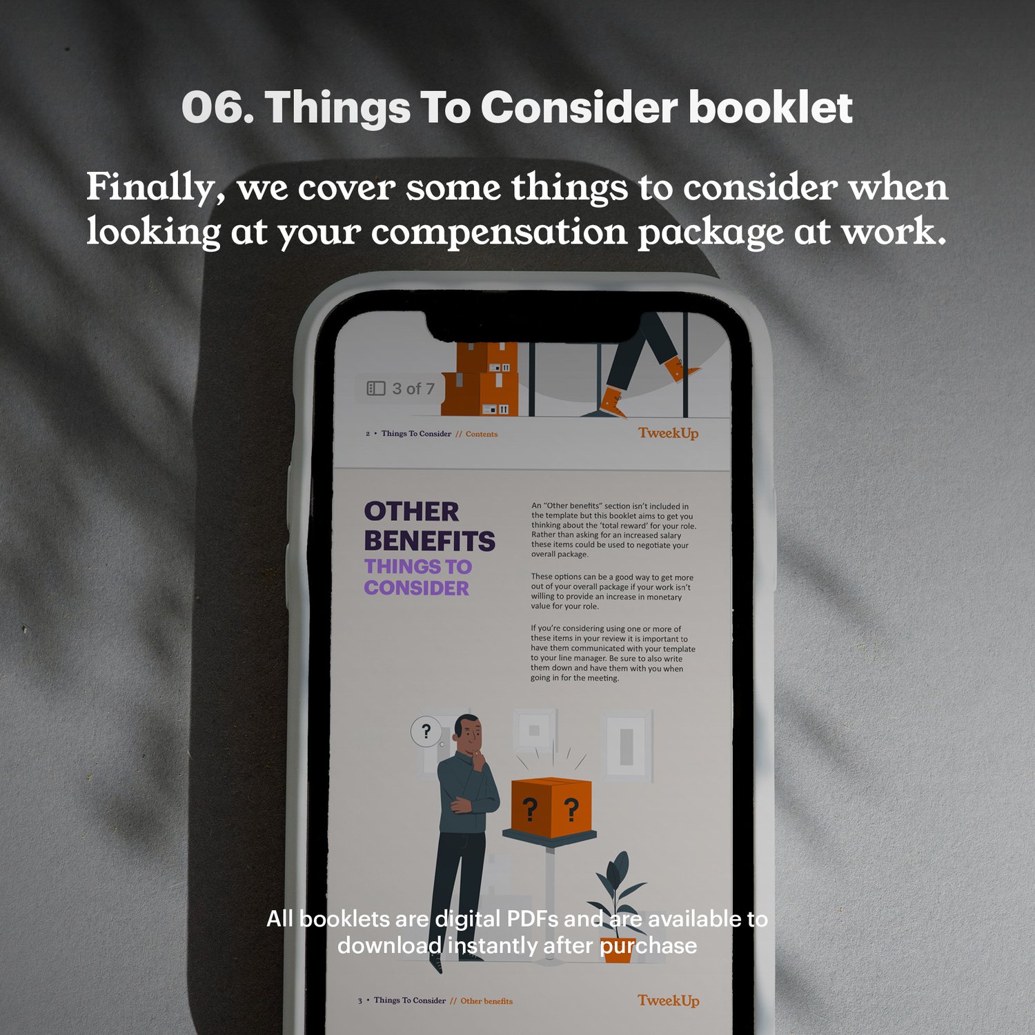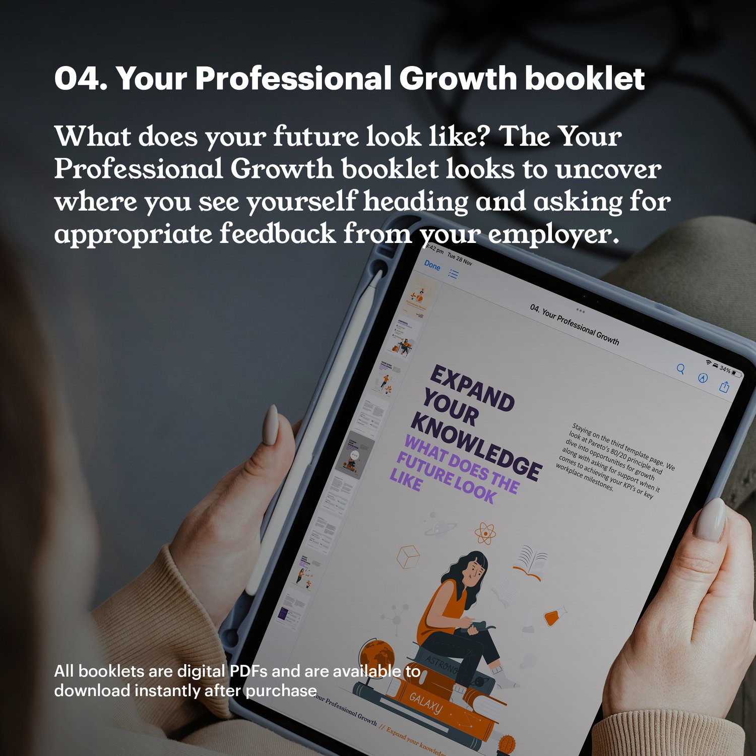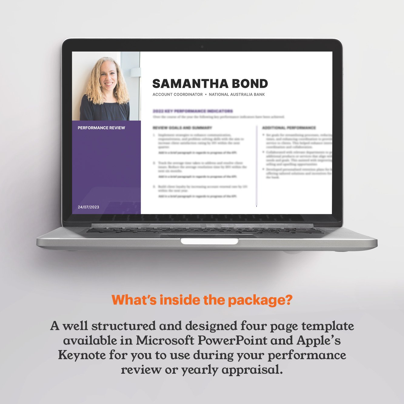 We have created a structured template available in Microsoft PowerPoint and Apple's Keynote for you to use for your performance review. Once filled in, this template turns into a presentation ready for you to showcase your value. To assist you in filling out the template, we have written five booklets filled with insights and knowledge, they are listed below: